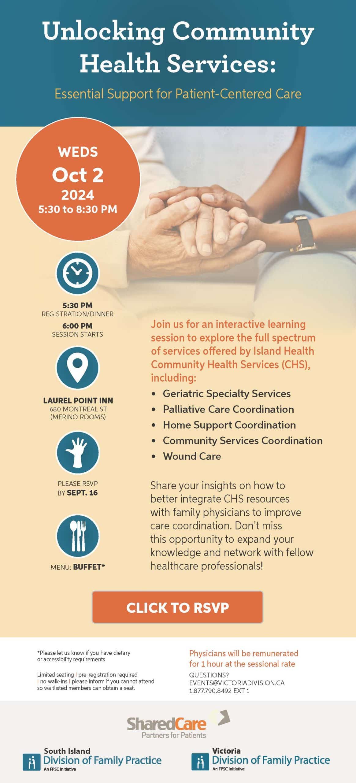 Join us on Wednesday, October 2 (5:30-8:30pm) for an interactive learning session to explore the full spectrum of services offered by Island Health Community Health Services (CHS), including geriatric specialty service, palliative care coordination, home support coordination, community services coordination, and wound care.